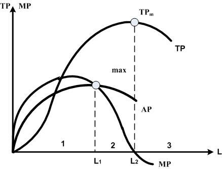 В результате можно выделить три участка этих кривых. На первом участке происходит увеличение производительности труда и рост объема производства (совокупного продукта). При равенстве среднего и предельного продуктов производительность труда – максимальная, однако возможности роста совокупного продукта еще до конца не исчерпаны за счет увеличения переменного параметра (в данном случае L). При значении L2 объем выпуска достигает максимума, а предельный продукт становится равным нулю.