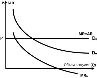 Другими словами, монополист может продать дополнительную единицу товара, лишь снизив на него цену. Вследствие убывающего характера кривой спроса кривая предельного дохода MR лежит ниже кривой спроса D при любом объеме выпуска и, соответственно, предельный доход ниже цены.