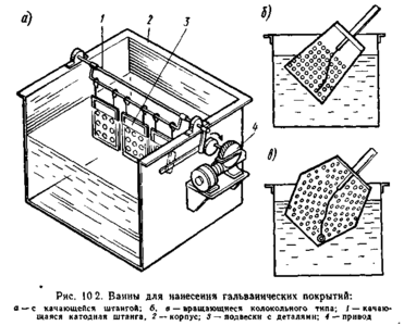 Нанесение покрытий производится в гальванических ваннах (рис. 10.2). Детали помещают на подвесках или в сетчатых корзинках. Большинство электролитов требует подогрева и перемешивания. В этих случаях применяют ванны с качающимися штангами (рис. 10,2, а). Они позволяют перемешивать электролит, не взмучивая шлам со дна ванны. Качание или встряхивание способствуют удалению с поверхности изделия выделяющихся при электролизе пузырьков водорода.
