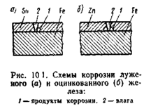 На рис. 10.1 показана схема коррозии луженого и оцинкованного железа. При повреждении оловянного покрытия (рис. 10.1, а) и соприкосновении его с влагой образуется гальванический элемент. Так как электрохимический потенциал железа (—0,44 В) электроотрицательнее олова (—0,14 В), то железо будет растворяться, а на олове будут разряжаться ионы водорода Н+, образуя газообразный водород. При повреждении цинкового покрытия (рис. 10.1, 5) в образовавшемся гальваническом элементе будет растворяться цинк (—0,76 В), а железо, имеющее менее электроотрицательный потенциал, разрушаться не будет. Таким образом, цинк будет электрохимически предохранять железо от коррозии.