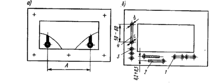 Для определения размеров оригинала печатной платы при фотографировании и для совмещения фотошаблонов на технологическом поле оригинала печатной платы выполняют кресты и другие реперные знаки. Кресты, выполненные по углам (рис. 12.8, а), предназначены для проверки точности соблюдения заданного масштаба уменьшения при фотографировании. Два из них, расположенные по диагонали или по большой стороне, используют в дальнейшем для пробивки базовых отверстий, а пятый крест - для ориентирования. При изготовлении печатных плат, не требующих высокой точности, допускается использование при фотографировании в качестве базового размер между наиболее удаленными контактными площадками (размер А).