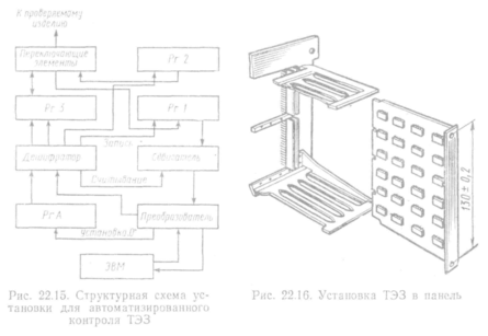 Для функционального контроля ТЭЗ используют автоматизированные системы контроля (АСК). Принцип работы АС К основан на тестовом методе проверки схем, который заключается в подаче на входы проверяемого ТЭЗ последовательности входных и анализе выходных сигналов. По результатам анализа делается заключение об их исправности. Автоматизированная система контроля позволяет выявить неисправные ТЭЗ с указанием выходных контактов, на которых сигналы отличаются от требуемых. Поиск конкретных мест неисправности осуществляют с помощью системы диагностики. Она позволяет получить значения логических сигналов на выводах всех микросхем для каждого набора контролирующих тестов, а также перечень адресов по схеме ТЭЗ и последовательность их проверки в случае неправильного логического сигнала на выходе любой микросхемы.