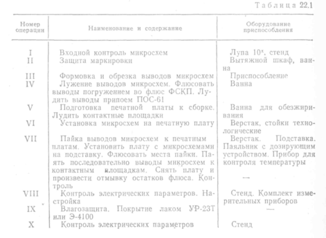 сновными этапами технологического процесса монтажа микросхем на печатной плате являются входной контроль печатных плат и микросхем, формовка, обрезка и лужение выводов, установка микросхем на печатные платы, пайка выводов микросхем к контактным площадкам печатной платы, контроль электрических параметров, покрытие лаком, окончательный контроль (табл. 22.1). Входной контроль микросхем заключается в визуальном осмотре при помощи лупы.