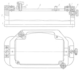 На основании 1 установлены стойки 2 с осями 3. Печатную плату закрепляют на раме 5 прижимами 4. Ее положение определяется штифтами 6. Требуемое положение платы фиксируется делительным диском 7 и штифтом 8.