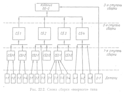 Схема сборки «веерного» типа (рис. 22.2) показывает, из каких деталей образуется сборка. Достоинством такой схемы является ее простота и наглядность, но она не отражает последовательность сборки.