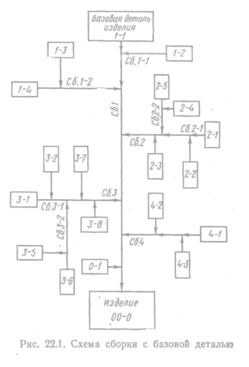 Схема сборки с базовой деталью (рис. 22.1) отражает последовательность процесса сборки. Базовой деталью является плата, панель или другая деталь, с которой начинается сборка. Направления движения деталей и узлов показаны стрелками.