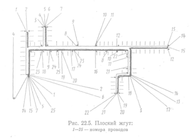 Раскладка жгутов производится на специальных шаблонах (плоских и пространственных). На рис. 22.5 показан жгут, изготовленный на плоском шаблоне. Последний представляет собой доску, на которой шпильками показано направление проводов. Конец провода заводят в отверстие шаблона и закрепляют шпилькой. Около каждой шпильки ставят номер провода. После этого провод прокладывают по контуру шаблона, загибая на угловых шпильках. Раскладка проводов заканчивается закреплением другого конца на конечной шпильке, имеющей тот же номер, что и начальная.