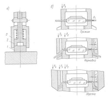 а рис. 22.11, а показана рабочая часть штампа для формовки и обрезки планарных выводов. Микросхема помещается в углубление формовочной матрицы 1. При опускании верхней плиты прижим 2 закрепляет выводы, а пуансон 3 производит их формовку. Обрезание выводов производится внешней кромкой пуансона, которая сопрягается с матрицей. Пружина возвращает пуансон в исходное положение при подъеме верхней части штампа. При выполнении формовки выводы подвергаются растягивающему усилию. Если оно будет большим, то в месте их заделки могут возникать трещины, приводящие к нарушению герметичности