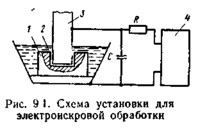 Обрабатываемая деталь 1 и инструмент 3 включаются в цепь электрического колебательного контура, работающего в области искрового разряда. Схема имеет два контура: зарядный и разрядный. Зарядный контур состоит из сопротивления R, конденсатора С и проводящих проводов; разрядный контур — из конденсатора, проводящих проводов и рабочих электродов: изделия 1 (анод) и инструмента 3 (катод). Изделие помещается в ванну с рабочей жидкостью 2 (керосин, трансформаторное масло и др.). Сила тока регулируется сопротивлением R. Конденсатор С заряжается от источника постоянного тока 4. Напряжение на электродах при этом увеличивается, так как они подключены параллельно конденсатору. При напряжении, равном величине пробоя, происходит разряд конденсатора через межэлектродный промежуток и энергия, накопленная конденсатором, мгновенно выделяется в процессе разряда.