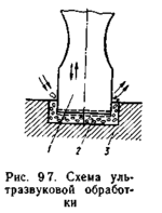 Ультразвуковая обработка представляет собой ударно-абразивный метод обработки твердых и хрупких материалов. Она осуществляется (рис. 9.7) инструментом 1, колеблющимся с ультразвуковой частотой 18... 20 кГц. Под торец инструмента подается водная суспензия абразивного порошка. Зерна абразива 2, «вбиваемые» инструментом в заготовку 3, скалывают материал