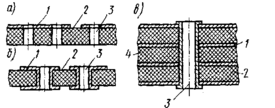 Многослойная печатная плата (рис. 12.1, в) состоит из чередующихся слоев изоляционного материала с проводящими рисунками на двух (и более) слоях, между которыми выполнены требуемые соединения.