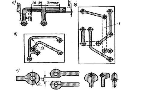 При одностороннем монтаже соединение пересекающихся проводников выполняют путем установки перемычек 1 из медного луженого провода (рис. 12.3, б). Перемычку ставят со стороны навесных элементов. Форма, протяженность и расположение печатных проводников могут быть произвольными в зависимости от конструктивных особенностей схемы. Однако во всех случаях не допускаются резкие перегибы, острые углы и переходы (рис. 12.3, в). Радиус закругления в местах перехода должен быть не менее 1 мм. Резкое изменение ширины и острые углы снижают механическую прочность сцепления проводников с основанием, и в процессе нагрева при пайке возможно отслаивание. Плавный переход устраняет местные перенапряжения и тем самым компенсирует разницу в тепловых деформациях фольги и диэлектрика.