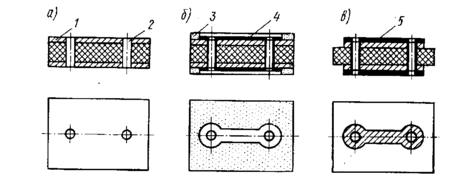на двустороннем фольгированном диэлектрике. Проводящий рисунок получают субтрактивным методом, а металлизацию отверстий осуществляют электрохимическим методом (рис. 12.18). Поверхность обеих сторон платы 1 и отверстия 2 подвергают химическому и предварительному гальваническому меднению для получения слоя меди толщиной 5...7 мкм (рис. 12.18, а). После подготовки металлизированных поверхностей на них создается негативное изображение схемы проводников 3 (рис. 12.18, б). Это изображение может быть получено с помощью сеткографической краски или сухого пленочного фоторезиста.