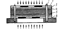 Для определения состояния геля ведут наблюдение за кромкой пакета. Через несколько минут на ней после предварительного сжатия появляется и начинает пузыриться смола. Момент, когда смола перестанет пузыриться (обычно через 1...2 мин), соответствует наступлению геля. В это время надо приложить полное давление. Воздух, находящийся между слоями, проходит через размягченную смолу и выходит наружу. Частично он задерживается у краев, образуя пустоты, которые удаляются при обрезке краев платы. Во избежание коробления после обрезки краев рекомендуется плату зажать между двумя пластинами и поместить на 40 мин в печь при t = 125°С.