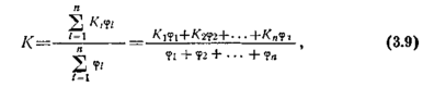 где Ki — значение показателя, определяемого по таблице состава базовых показателей; φ — коэффициент, нормирующий весовую значимость показателя в зависимости от его порядкового номера в таблице; п — общее количество частных показателей; i — порядковый номер показателя в ранжированной последовательности.