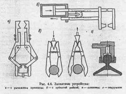 Захватное устройство может совершать дополнительные движения с помощью приводов, расположенных на захвате или вне его. К ним предъявляются следующие требования: надежность захватывания и удержания деталей, стабильность базирования, возможность быстрой переналадки, недопустимость повреждения объектов. Принцип действия и конструкции захватывающих устройств (ЗУ) весьма разнообразны, так как многообразны объекты манипулирования.