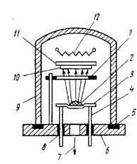 8 - изолятор выводов; 9 - колпак; 10 - подложка; 11- держатель подложки; 12 – нагреватель.