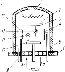 8 - изолятор выводов; 9 - колпак; 10 - подложка; 11- держатель подложки; 12 – нагреватель.