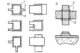Конденсаторы получают в виде трехслойной структуры (рис. 15.2, а) проводник – диэлектрик - проводник. При этом нижняя обкладка 2 конденсатора выходит за периметр верхней обкладки 3, а периметр диэлектрической пленки 1 выходит за периметр нижней обкладки. Это исключает возможность замыкания обкладки и устраняет погрешность от их смещения. Для конденсаторов небольшой емкости (десятки пикофарад) обкладки конденсаторов выполняют в виде двух взаимно пересекающихся проводников 1, разделенных пленкой диэлектрика 2.