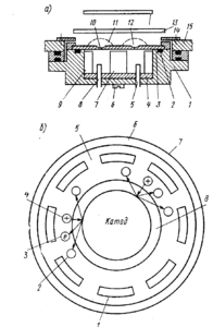 а - магнетрон с плоским катодом; б - схема бомбардировки катода; 1 - подложка;