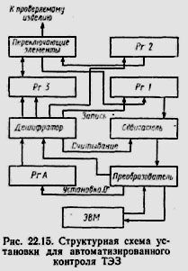 Переключающие элементы позволяют распознавать входные и выходные сигналы для проверяемых ТЭЗ. В зависимости от состояния соответствующего разряда регистра РгЗ сигнал переключающего элемента (ПЭ) является выходным с проверяемого ТЭЗ и поступает на вход Рг1 или, наоборот, является входным для проверяемого ТЭЗ. Сдвигатель предназначен для согласования по разрядности ЭВМ и проверяемого ТЭЗ. Время проверки одного ТЭЗ составляет примерно 2 мин при числе проверяющих наборов контролирующего теста не более 100.