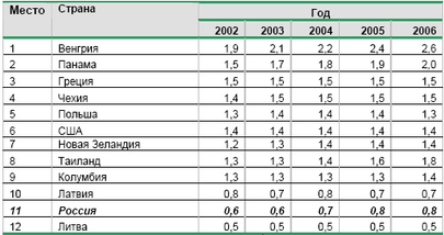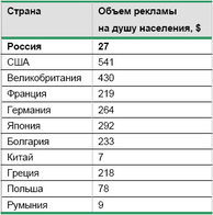 Табл. 3. Объем расходов на рекламу на душу населения по итогам 2004 года