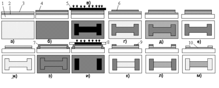 а - напыление сплошных резистивного и проводящего слоев, б - нанесение первого слоя фоторезиста, в - экспонирование первого слоя фоторезиста, г - проявление первого слоя фоторезиста, д - травление проводящего слоя, е - травление резистивного слоя, ж - удаление слоя фоторезиста, з - нанесение второго слоя фоторезиста, и - экспонирование второго слоя фоторезиста, к - проявление второго слоя фоторезиста, л - травление проводящего слоя, м - удаление второго слоя фоторезиста, 1 - подложка, 2 , 3 - слои резистивного и проводящего материаа, 4, 7 - слои фоторезиста, 5, 8 - фотошаблоны, 6, 9 - фоторезистивные маски, 10 - резистор с контактными площадками.