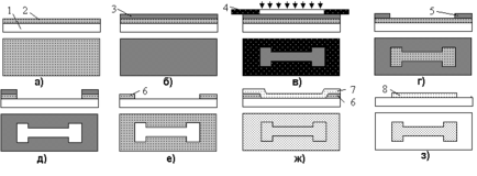 а - напыление материала контактной маски, б - нанесение слоя фоторезиста, в - экспонирование, г - проявление, д - травление материала контактной маски через фоторезистивную маску, е - удаление слоя фоторезиста, ж - напыление резистивного материала, з - травление материала контактной маски; 1 - подложка, 2 - слой меди, 3 - слой фоторезиста, 4 - фотошаблон, 5, 6 - фоторезистивная и контактная маски, 7 - слой резистивного материала, 8 - резистивная полоска.