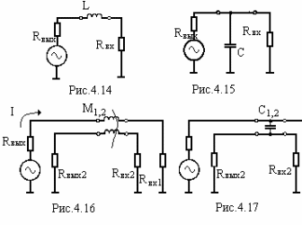 При синтезе топологии по допустимой задержке сигнала в линиях связи и допустимому напряжению Uп доп определяются требования к величине паразитных реактивных параметров линий связи и в соответствии с табл.4.2 к геометрическим параметрам проводников: L<Rвх при индуктивном характере связи (рис. 4.14); C</Rвых при емкостном характере связи (рис. 4.15); M1,2 < Uп доп ф/I при индуктивной взаимной связи (рис. 4.16); C1,2 < Uп доп ф/Urвых при емкостной взаимной связи (рис. 4.17), где постоянная времени цепи, ф - длительность фронта импульса.