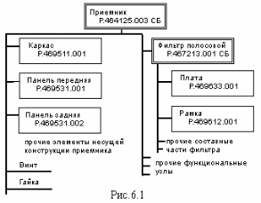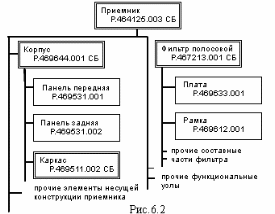 Такая структурная схема позволяет упростить процедуру подбора по классификатору кодов для всех составных частей и присвоения им порядковых номеров, а кроме того, учитывать также и тип производства. Например, схема на рис. 6.1 соответствует мелкосерийному или индивидуальному производству, когда соединение между собой частей несущей конструкции блока приемника (каркаса, передней и задней панели, кожуха и т.д.) и установка и присоединение функциональных узлов выполняются в одном технологическом процессе окончательной сборки.
