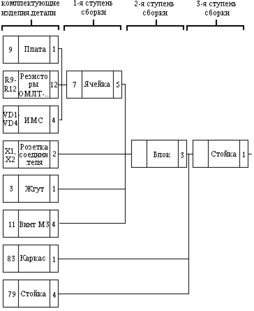 Схема сборочного состава (схема "веерного" типа) раскрывает конструктивно - технологическую входимость субъектов сборки, состав сборочных комплектов и этапы ("ступени") сборки (рис.5.2).