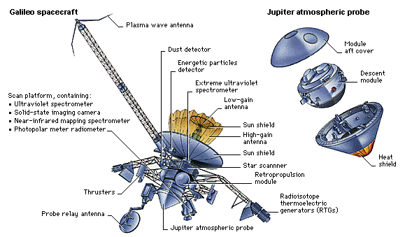 The Galileo spacecraft, launched in 1989 with the ultimate destination of Jupiter, carried a number of scientific instruments on board to study the solar system while on route to Jupiter, including a radiometer and ultraviolet, extreme ultraviolet, and near-infrared spectrometers, which take pictures of light outside the visible range. Upon arrival at Jupiter in 1995, Galileo released a probe that plunged into the planet’s fiery atmosphere, transmitting vital scientific data before it was destroyed.