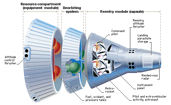 Ten piloted Gemini spacecraft were launched between March 1965 and November 1966. Unlike earlier American spacecraft, Gemini capsules were designed to carry two astronauts. Before returning to the earth, the crew jettisoned the resource compartment and the deorbiting system. The reentry module floated to a watery splashdown on earth using a parachute.