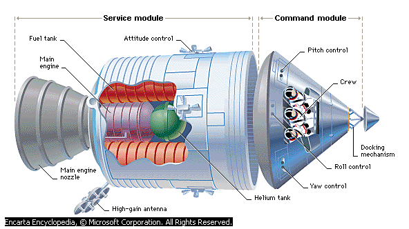 Astronauts used the command and service modules of the Apollo spacecraft to orbit the earth, travel to the moon, and return to the earth. The command module housed the astronauts during take-off and reentry into the earth's atmosphere. The service module carried consumable supplies such as fuel, food, and water, and was detached from the command module before the astronauts reentered the atmosphere.
