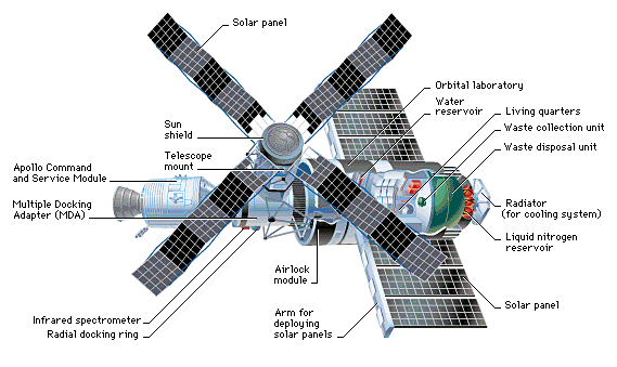 Skylab, the first U.S. space station, utilized hardware originally created for the Apollo program. The main component, called the orbital workshop, was constructed inside the third stage of a Saturn V booster. It contained living and working space for three astronauts. Attached to the orbital workshop were the Apollo telescope mount (ATM), a collection of instruments to study the Sun from space; an airlock module to enable two of the astronauts to make spacewalks while the third remained inside; and a multiple docking adaptor (MDA) for use by the Apollo spacecraft that would ferry the crew to and from orbit. Altogether, Skylab weighed 91 metric tons and offered 210 cu m (7,400 cu ft) of habitable space.
