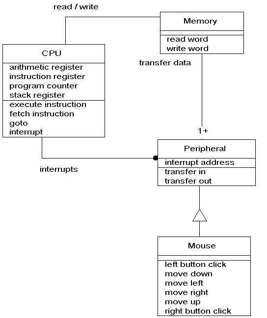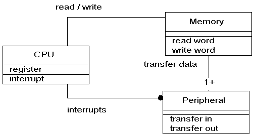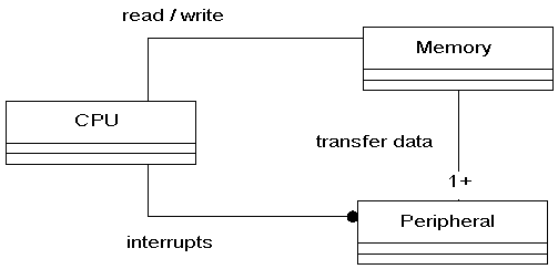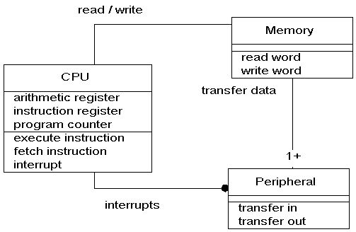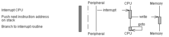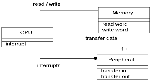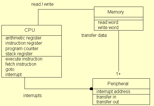 The CPU (central processing unit) reads and writes words to and from memory. A peripheral (such as a keyboard or screen) has information transferred to or from memory. A peripheral can also interrupt the CPU. (For the non-computer scientist venturing this far, an interrupt is an electronic signal which forces the CPU to jump to a special instruction stored in memory). There needs to be at least one peripheral to make the computer useful (intraverted computers are of little use). However, not all peripherals use interrupts, so it is possible to have a CPU without interrupts (unlikely, but some simple computers operate this way).