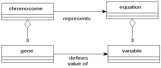 Now we could represent this with a sequence of three genes, each gene being an integer value for x, y and z. We end up with an object diagram: