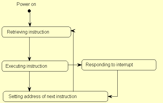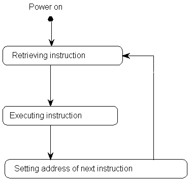 The CPU loops endlessly, fetching instructions and executing them. We can see from this state diagram that the CPU needs somewhere to store the address of an instruction. It is also clear that there is a need to store an instruction retrieved from memory. Our object model grows a little more.