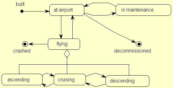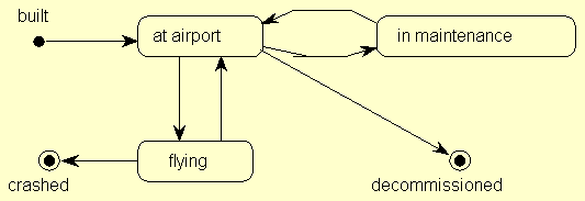 What do we learn from this modelling? Firstly, the states need to be recorded in the attributes of an object. For example, we may need an attribute ("is flying", say) which is true or false to indicate whether an aeroplane is flying or not. Also, we recognise the need for operations to cause the state transitions. For example, we may need a "take off" operation to enable the object to move from "at airport" to "flying". The transition diagram also indicates some of the things the operation must do, such as change the attributes which determine the state.