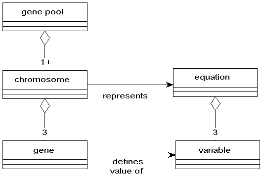 Of course, this is all very uninteresting, until you start putting lots of chromosomes together in a gene pool. The chromosomes can start with randomly chosen values, and you end up with a large number of equations with different values.