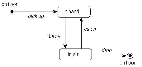 State diagrams allow you to further explore the operations and attributes that need to be defined for an object. They consist of sets of states which an object is in, and events which take the object from one state to another. Let us go back to our juggling example. A juggling ball starts on the floor, and alternates between being held and being in the air, until it is dropped and lands on the floor. This can be drawn like this: