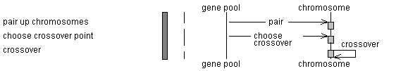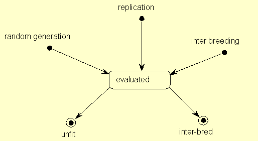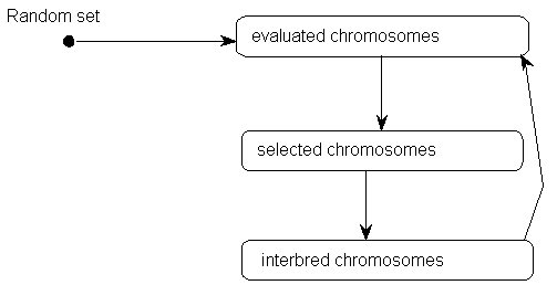 From a randomly generated set of chromosomes, firstly all the chromosomes are evaluated for their fitness, which is done by evaluating the equation which the chromosome represents. Then the chromosomes are selected; strong ones (ie those with a high fitness) have multiple copies made. Weak ones are destroyed. Then the selected chromosomes are interbred, by mixing their genes up in some way. Then the new set of chromosomes are evaluated, and the process goes on indefinitely. Let us examine the state transition of a chromosome.