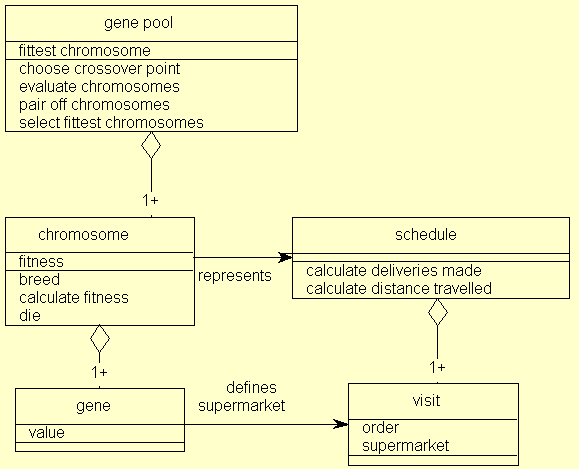 This time the gene represents a particular supermarket rather than the value of a variable. The fitness function would return zero if the schedule broke the mileage limit, or the number of Christmas puddings delivered if the schedule is within the mileage limit.