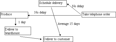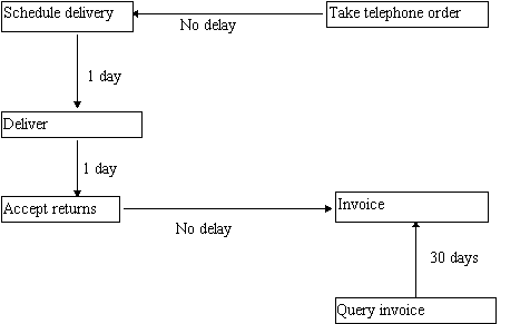 So far, temporal and information flow aspects have been omitted from the model. The reason for this is that at the functional level similar businesses rarely differ. However, at the operational level they do. By introducing temporal and information flows, analysis of different aspects of a business can be incorporated. Two simplified examples drawn from actual projects are given below. They use activities defined in the activity model to indicate information flows, and the effect of delays on information flows.