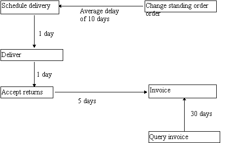 Changes to standing orders were taken by the salesman visiting the customer. These were taken on paper, and by the time the salesman had returned to the office, and the changes recorded on the computer system, an average of ten days elapsed. The consequence was that a high number of deliveries, approximately 5%, were not as the customer now wanted them. Therefore there were returns which the depot recorded on paper, and sometimes extra emergency deliveries. Returns took five days to record on the computer system. However, the practice was to issue invoices the day after delivery, and the standing orders were used. The customer would then query the invoice, usually at the end of the 30 day payment period; then they would pay the re-issued and correct invoice at the end of a further 30 days payment period.