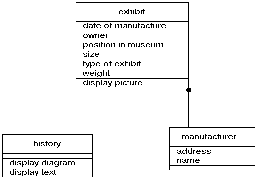 It would seem that these could all be grouped together under the object exhibit. The question is, can these all be considered to be one object. In this case, the answer is probably yes. In the museum the behaviour of cars, photographs, and garages are not radically different, so we can group them together. We can differentiate between the individual objects on the basis of an attribute, say type.