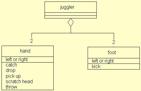 The diamond in the diagram indicates that one object is made up of another object. The numbers are indicative of how many - more will be said about this shortly. Now the behaviour of a juggler is entirely defined by the behaviour of his or her hands and feet. Of course, real jugglers are made of quite a bit more, but for the purposes of considering their juggling skills we can focus on just the bits of them that are involved in juggling.