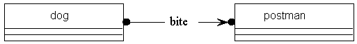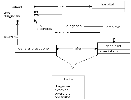 Objects can be related in other ways than by inheritance and aggregation. Any relationship between real world objects can be modelled: cats eat canaries, dogs bite postmen, the woodcutter murders the wolf, cars run over little old ladies, employees work for organisations, patients visit hospitals, patients stay in hospitals.