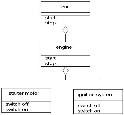 To start a car, you start the engine. Thus the start operation on the car involves calling the start operation on the engine. This is known as delegation. The engine then will switch on the ignition system, switch on the starter motor then switch off the starter motor. This is further delegation. To stop the car, there will be a call to stop the engine, which in turn will make a further call to switch off the ignition.