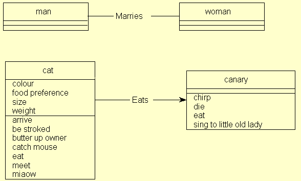 Thus a man marries one woman (at a time) and a woman marries one man (at a time). A cat eats one canary (before being battered to death by the little old lady who owned the canary). Canaries do not (in general) eat cats, so the eats relationship is one way.